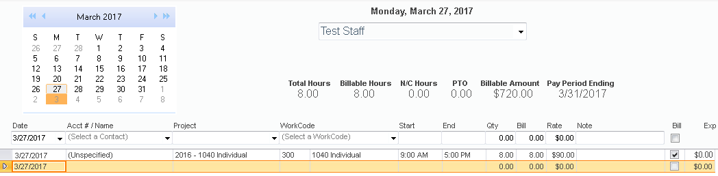Expense tracking and mileage will also take place on time cards. Because all time entries will have a client and a work code, expense codes and mileage will be associated directly to the contact the time entry is associated to.