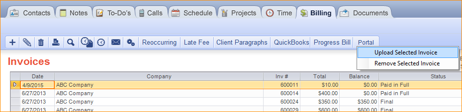 To sync an invoice from with WorkSpace, go to the Billing Tab > Invoices view and highlight the desired invoice by clicking on it. Then click the Portal button and select “Upload Selected Invoice”